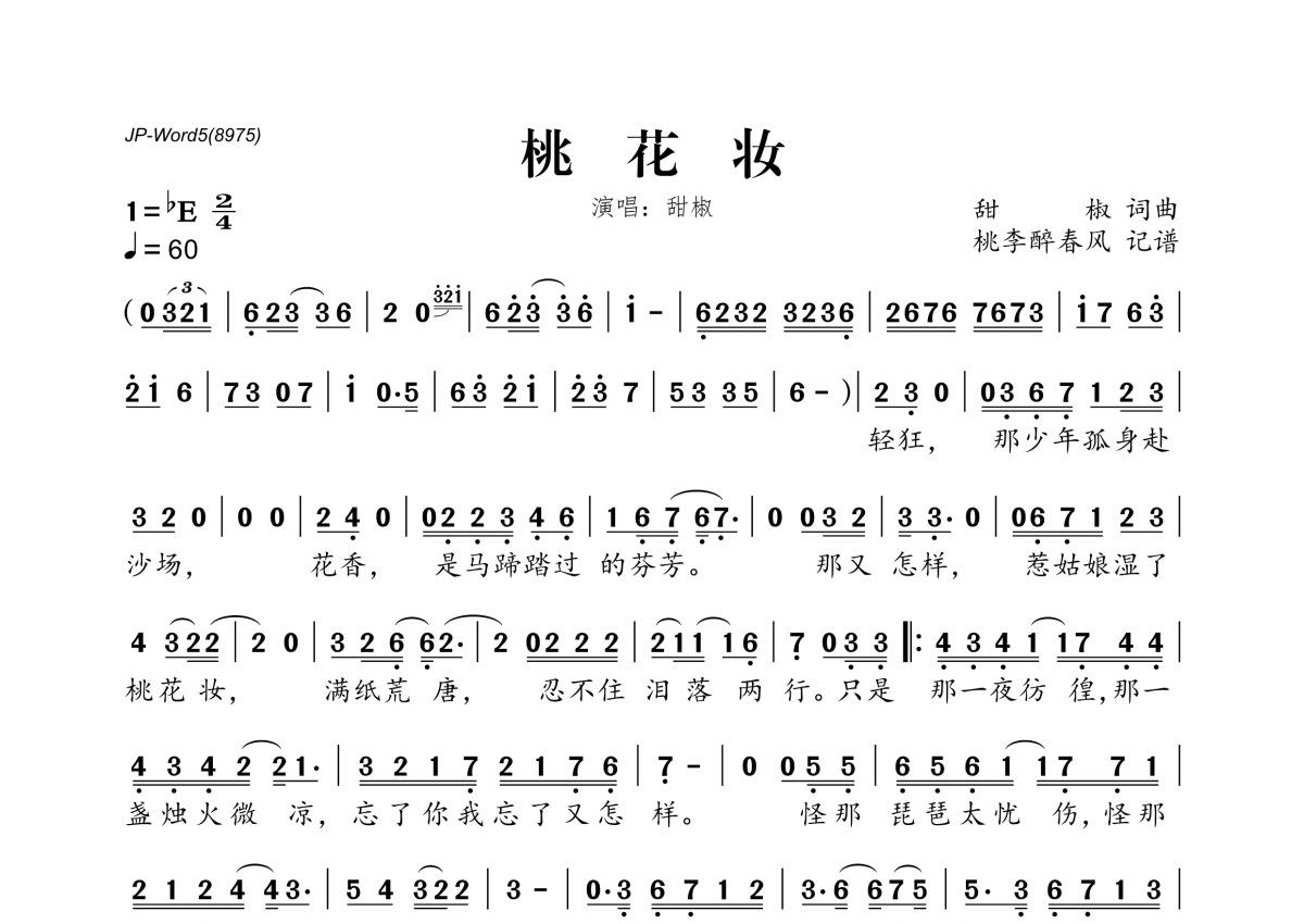 《桃花妆》是甜椒演唱的一首歌曲,拍号为2/4拍,歌曲速度为每分钟60拍,这份简谱共有一张高清图谱,图谱由 @桃李醉春风 编配上传。