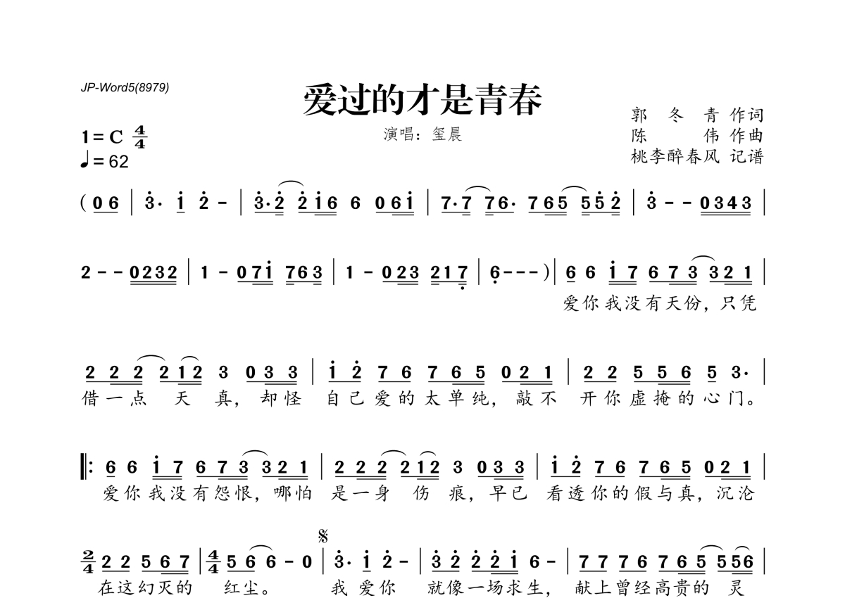 《爱过的才是青春》是玺晨演唱的一首歌曲,拍号为4/4拍,歌曲速度为每分钟62拍,这份简谱共有一张高清图谱,图谱由 @桃李醉春风 编配上传。