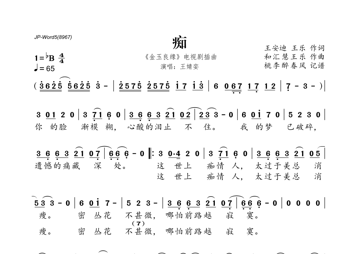《痴》是王婧娈演唱的一首歌曲,拍号为4/4拍,歌曲速度为每分钟65拍,这份简谱共有一张高清图谱,图谱由 @桃李醉春风 编配上传。