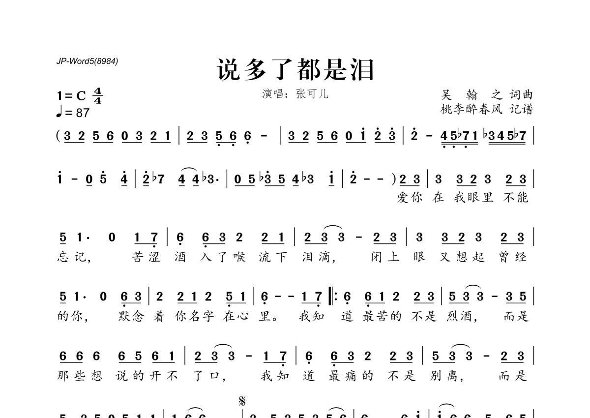 《说多了都是泪》是张可儿演唱的一首歌曲,拍号为4/4拍,歌曲速度为每分钟87拍,这份简谱共有一张高清图谱,图谱由 @桃李醉春风 编配上传。