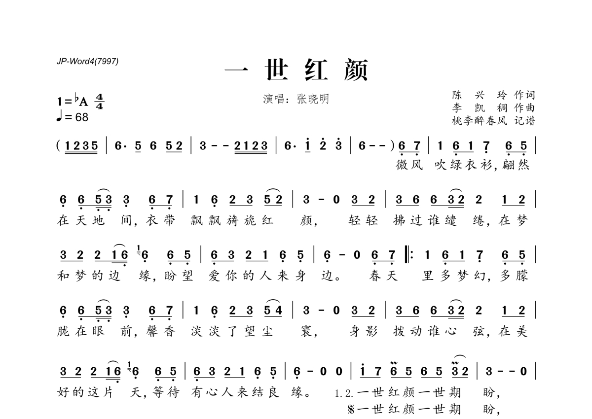 《一世红颜》是张晓明演唱的一首歌曲,拍号为4/4拍,歌曲速度为每分钟68拍,这份简谱共有一张高清图谱,图谱由 @桃李醉春风 编配上传。