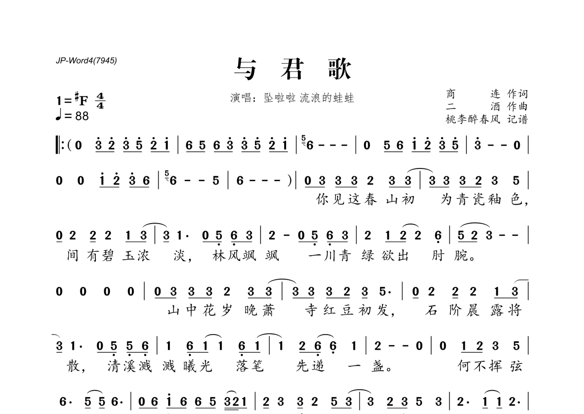《与君歌》是坠啦啦&流浪的蛙蛙演唱的一首歌曲,拍号为4/4拍,歌曲速度为每分钟88拍,这份简谱共有一张高清图谱,图谱由 @桃李醉春风 编配上传。