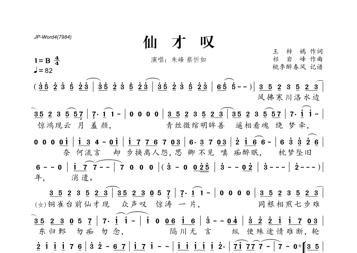 《仙才叹》是朱峰&蔡忻如演唱的一首歌曲,拍号为4/4拍,歌曲速度为每分钟82拍,这份简谱共有一张高清图谱,图谱由 @桃李醉春风 编配上传。