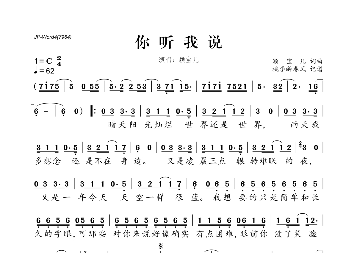 《你听我说》是颖宝儿演唱的一首歌曲,拍号为2/4拍,歌曲速度为每分钟62拍,这份简谱共有一张高清图谱,图谱由 @桃李醉春风 编配上传。