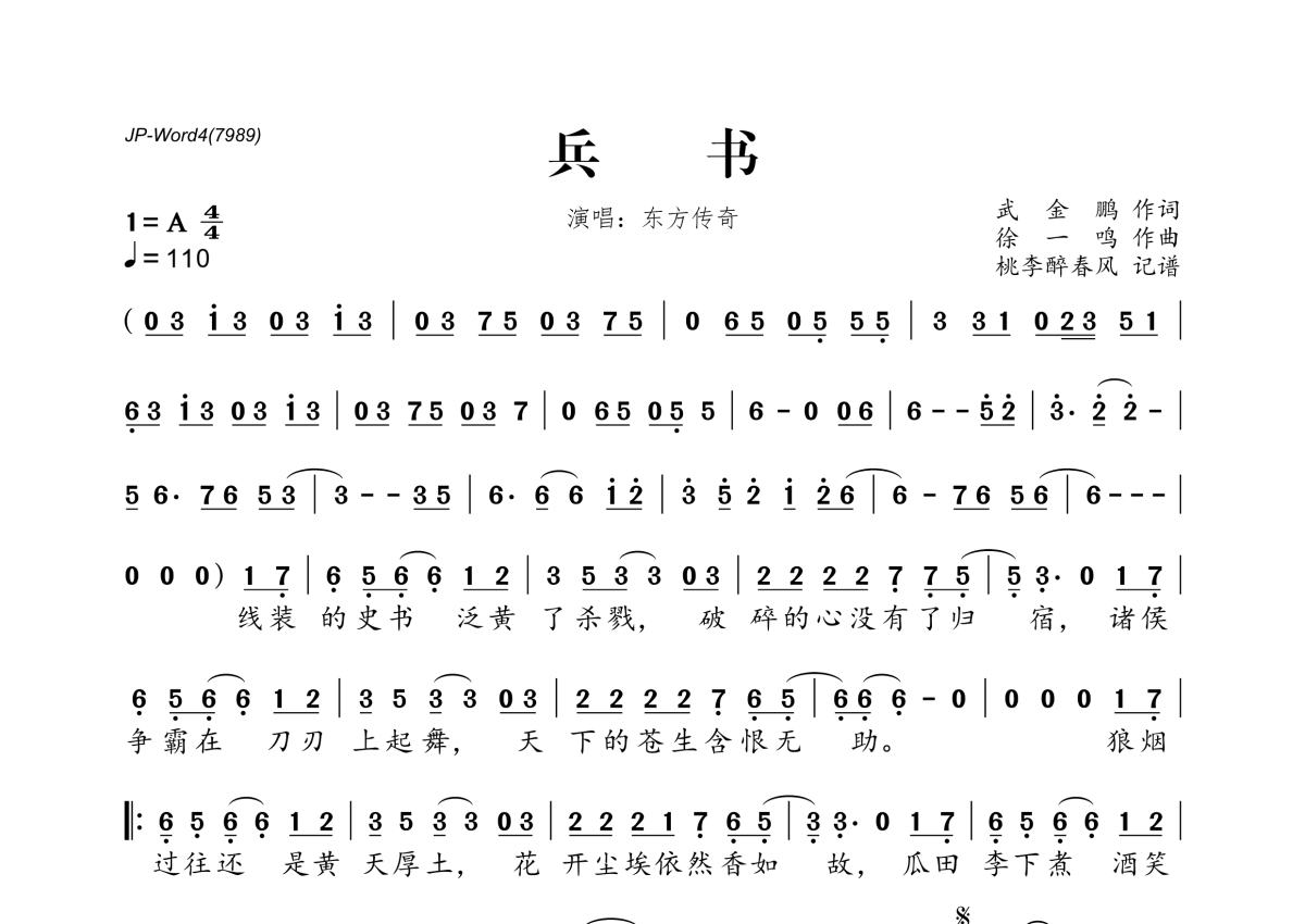 《兵书》是东方传奇演唱的一首歌曲,拍号为4/4拍,歌曲速度为每分钟110拍,这份简谱共有一张高清图谱,图谱由 @桃李醉春风 编配上传。