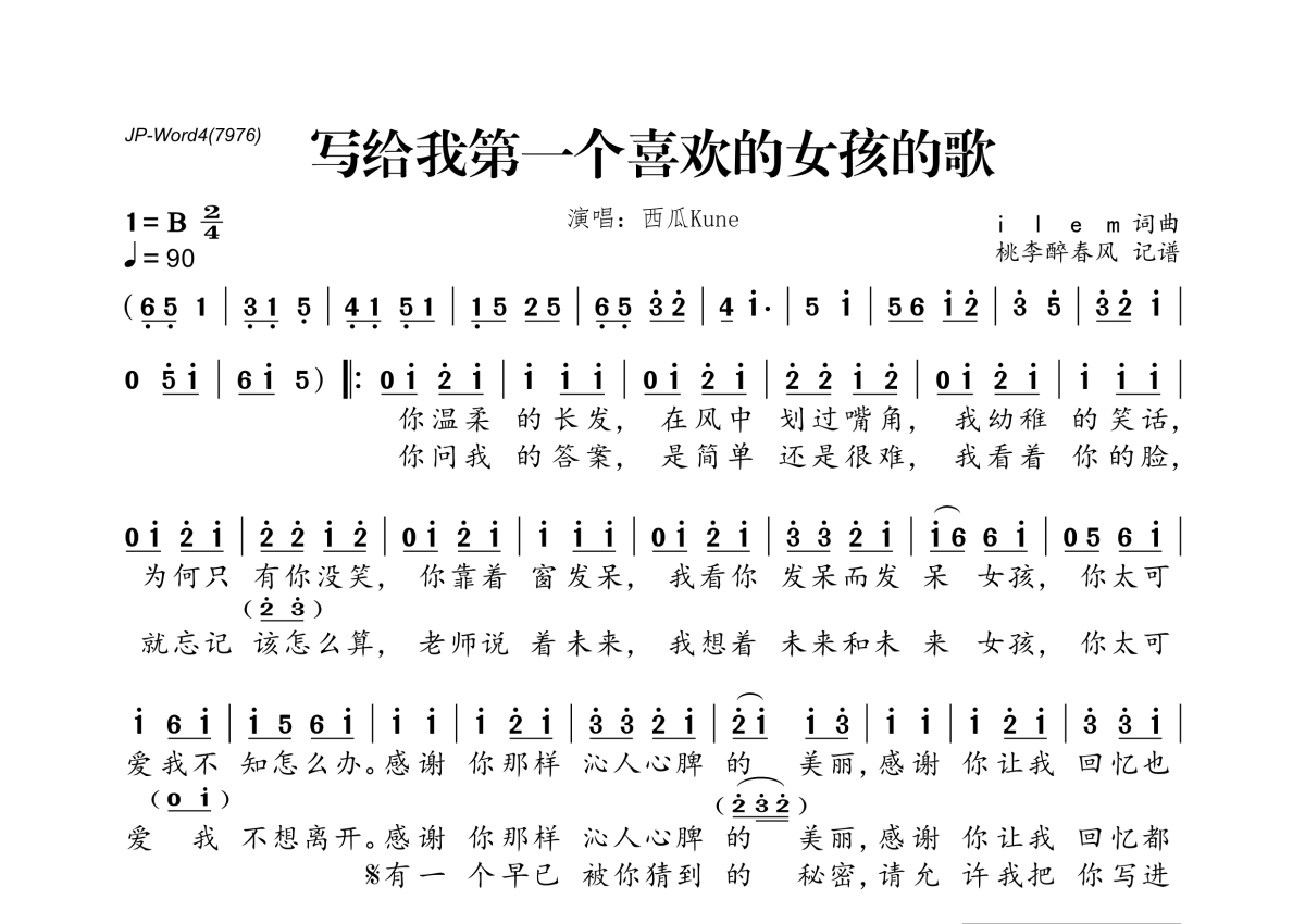 西瓜Kune《写给我第一个喜欢的女孩的歌》简谱