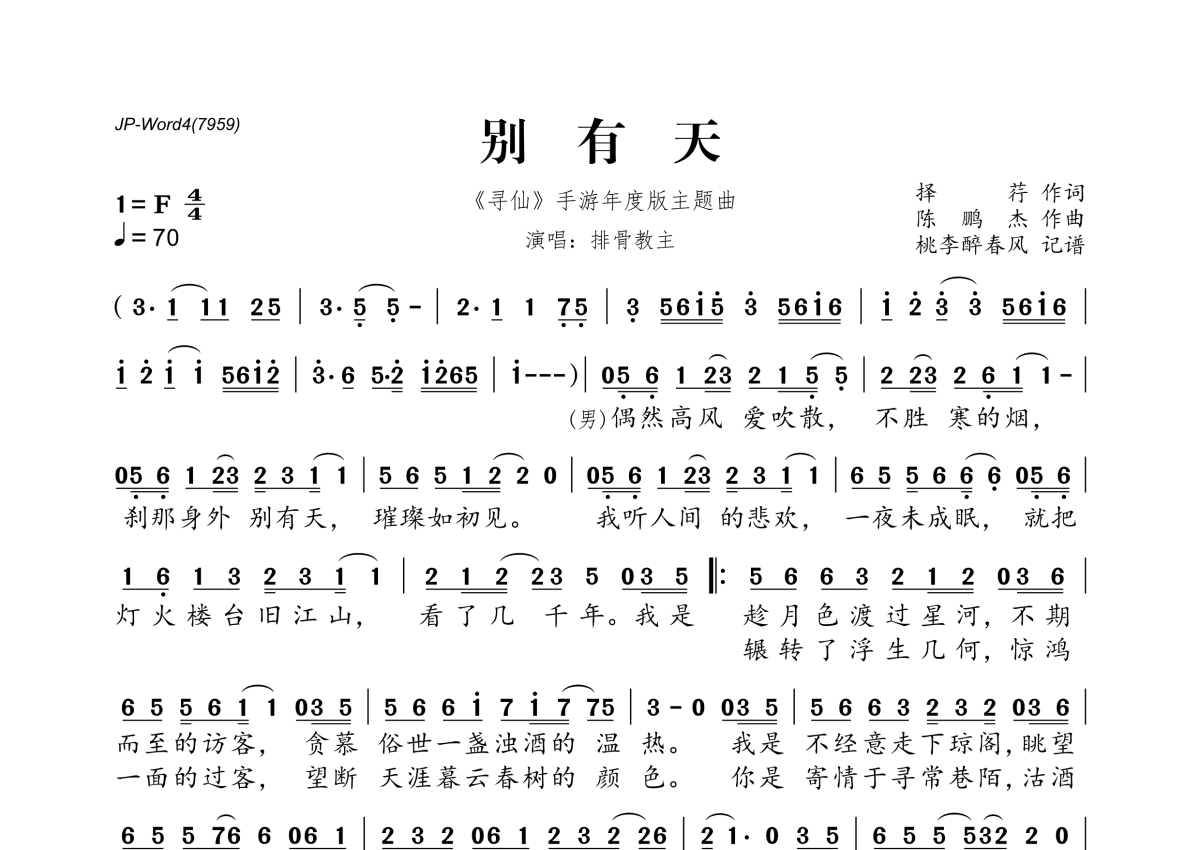 《别有天》是排骨教主演唱的一首歌曲,拍号为4/4拍,歌曲速度为每分钟70拍,这份简谱共有一张高清图谱,图谱由 @桃李醉春风 编配上传。