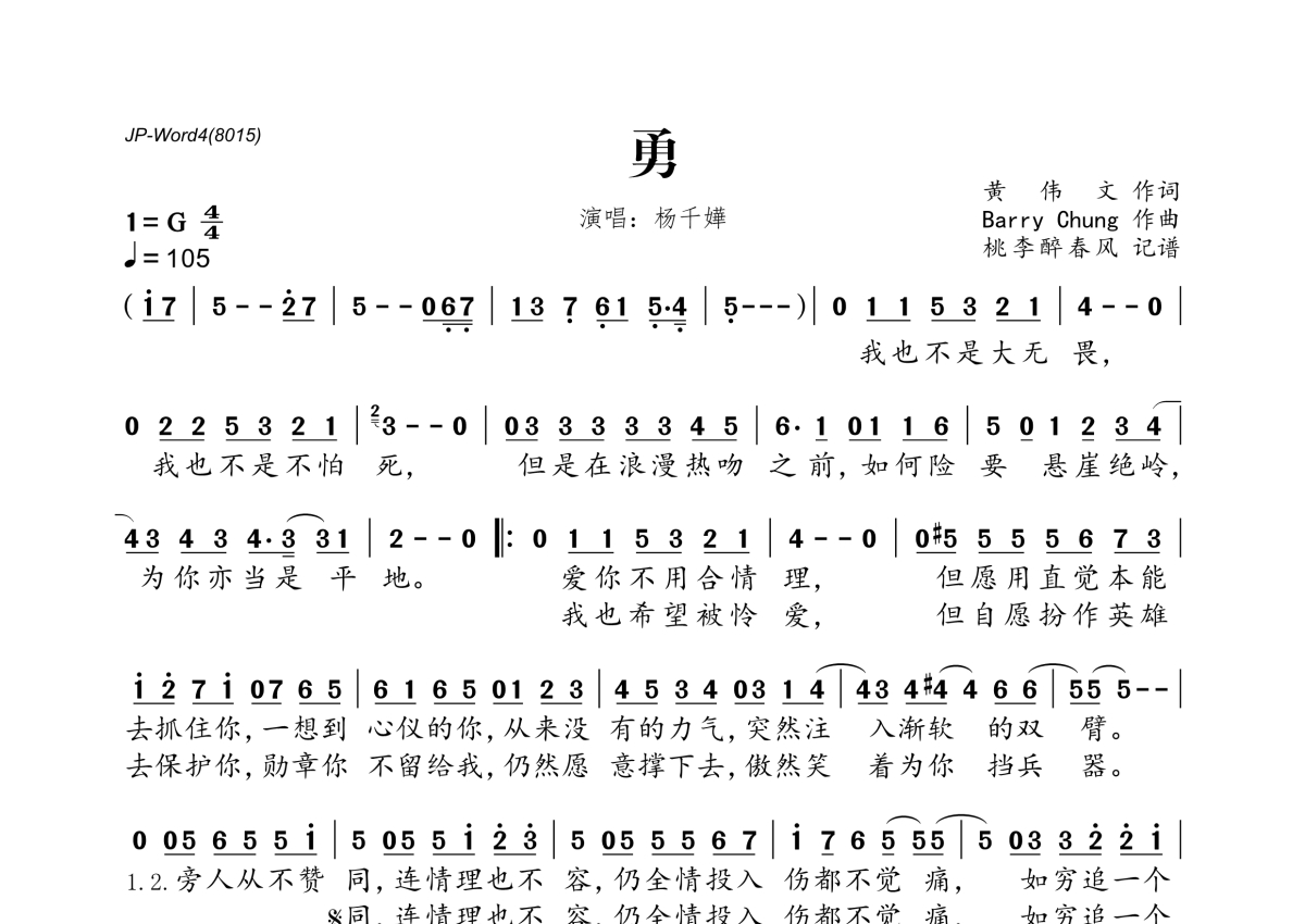《勇》是杨千嬅演唱的一首歌曲,拍号为4/4拍,歌曲速度为每分钟105拍,这份简谱共有一张高清图谱,图谱由 @桃李醉春风 编配上传。
