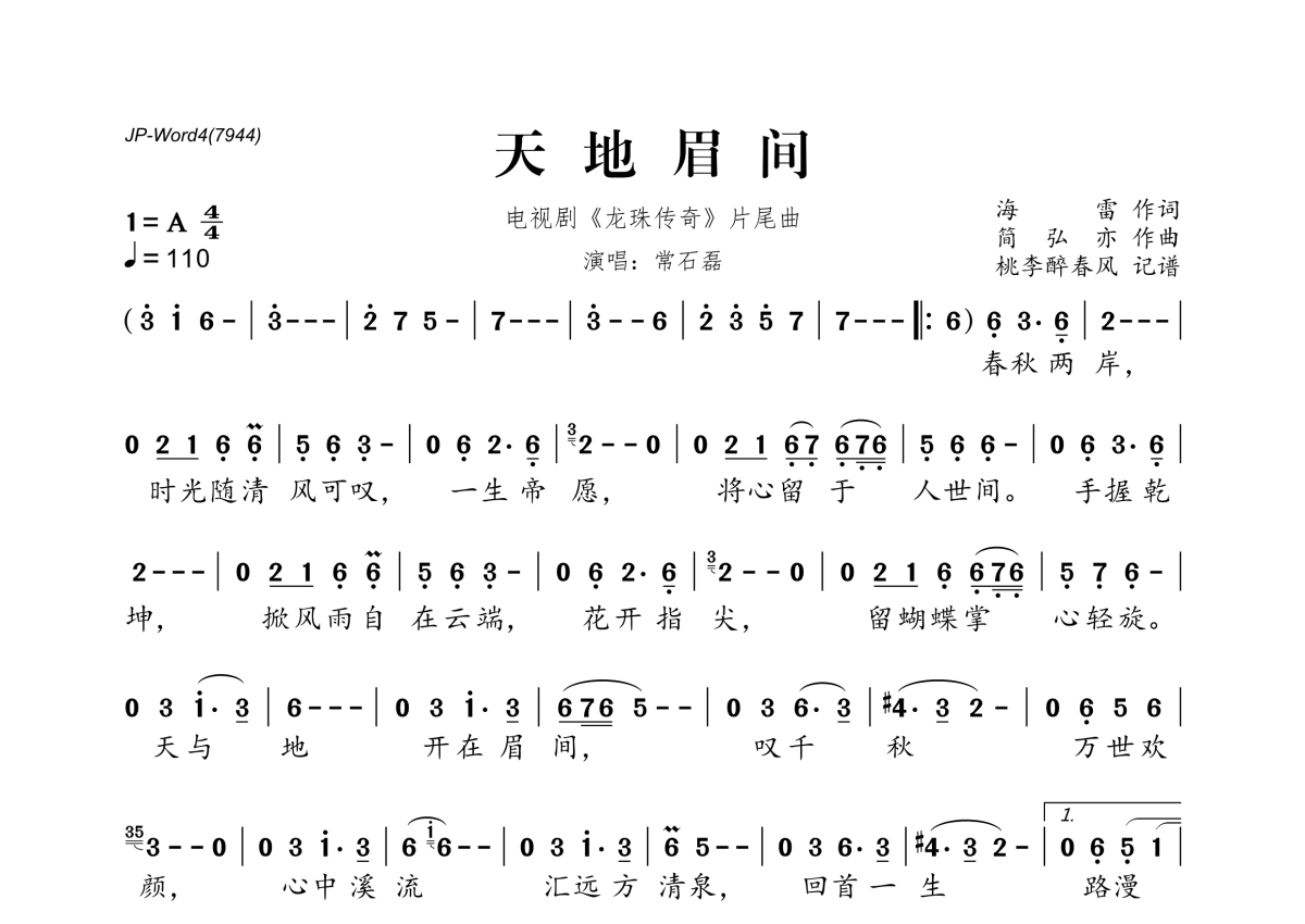 《天地眉间》是常石磊演唱的一首歌曲,拍号为4/4拍,歌曲速度为每分钟110拍,这份简谱共有一张高清图谱,图谱由 @桃李醉春风 编配上传。
