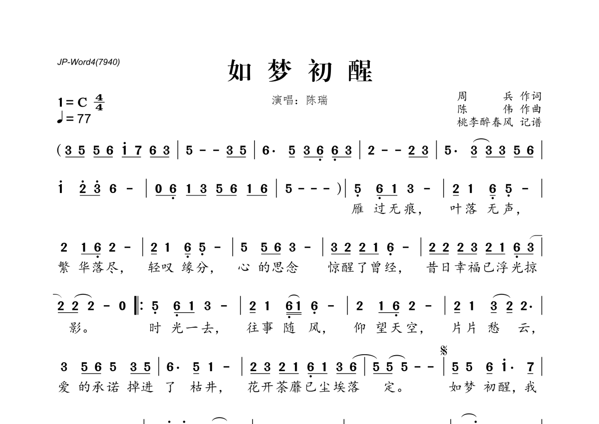 《如梦初醒》是陈瑞演唱的一首歌曲,拍号为4/4拍,歌曲速度为每分钟77拍,这份简谱共有一张高清图谱,图谱由 @桃李醉春风 编配上传。