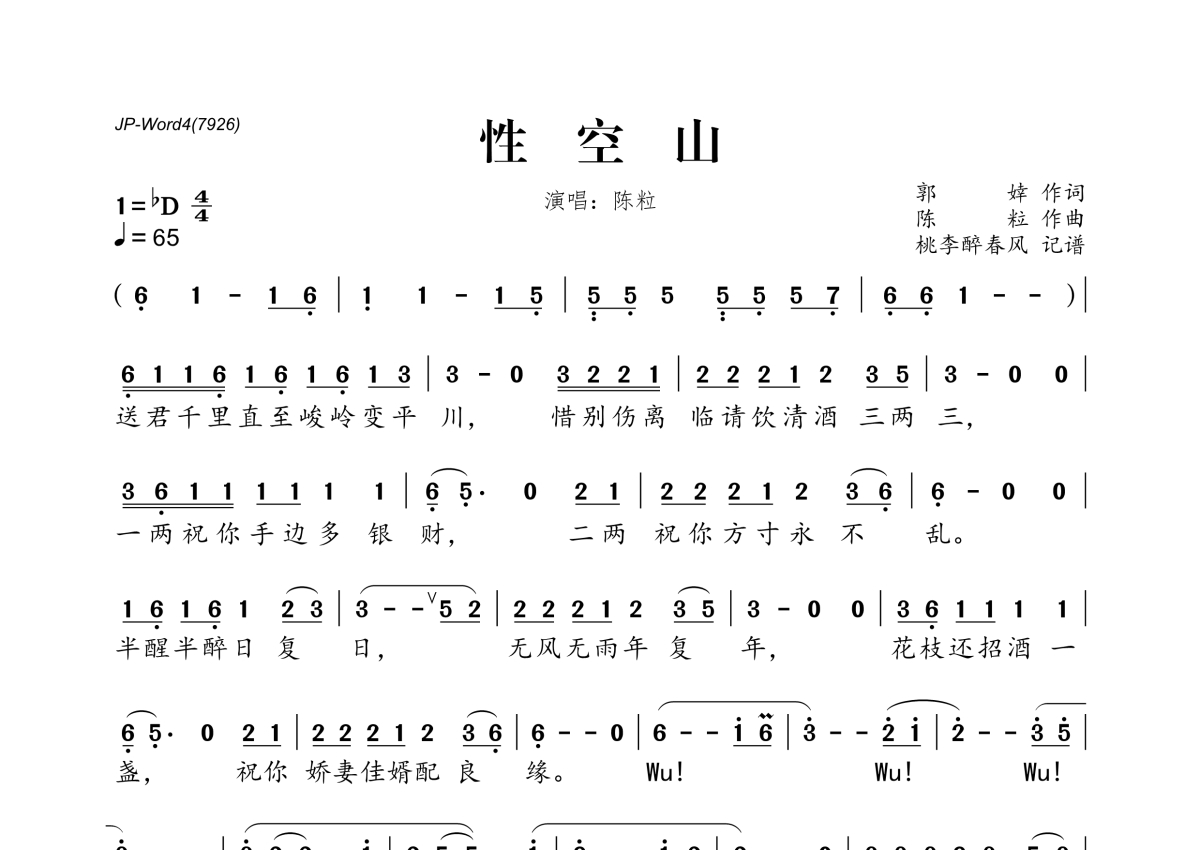 《性空山》是陈粒演唱的一首歌曲,拍号为4/4拍,歌曲速度为每分钟65拍,这份简谱共有一张高清图谱,图谱由 @桃李醉春风 编配上传。