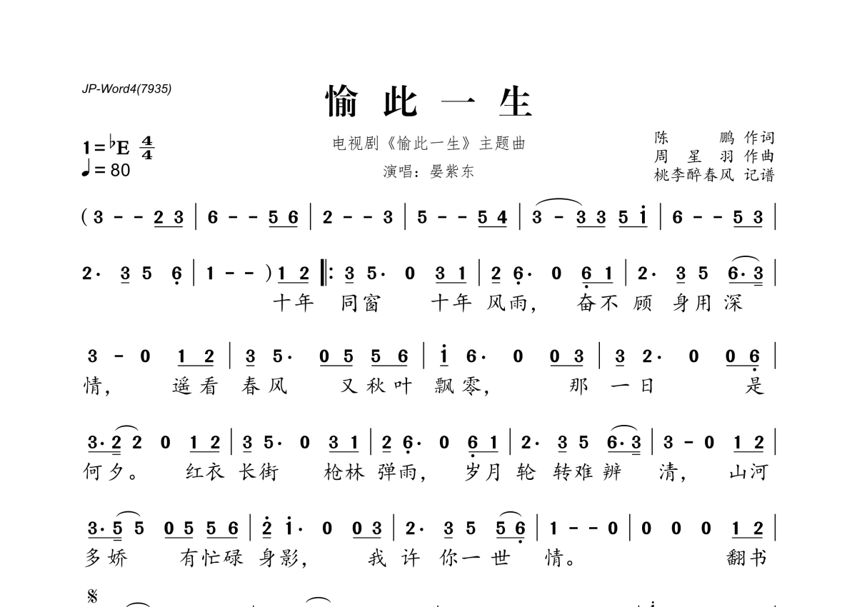 《愉此一生》是晏紫东演唱的一首歌曲,拍号为4/4拍,歌曲速度为每分钟80拍,这份简谱共有一张高清图谱,图谱由 @桃李醉春风 编配上传。