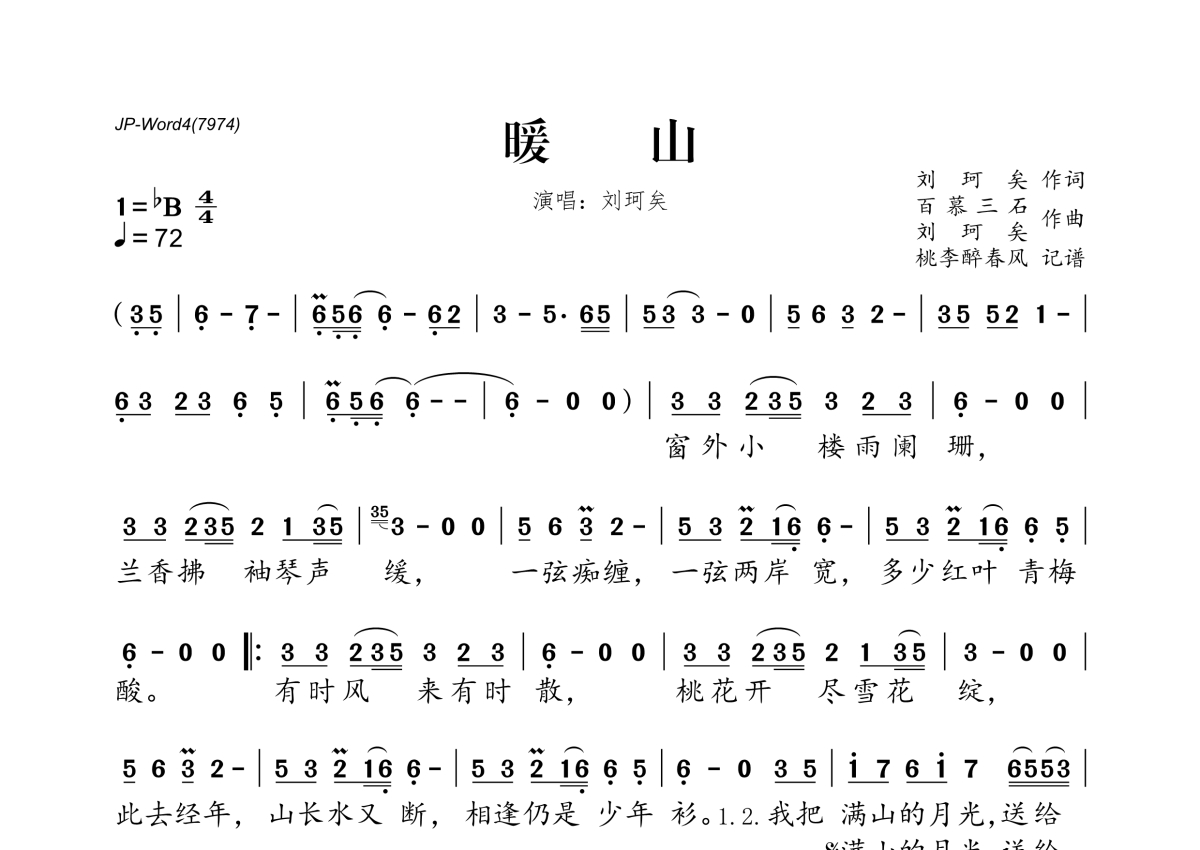 《暖山》是刘珂矣演唱的一首歌曲,拍号为4/4拍,歌曲速度为每分钟72拍,这份简谱共有一张高清图谱,图谱由 @桃李醉春风 编配上传。