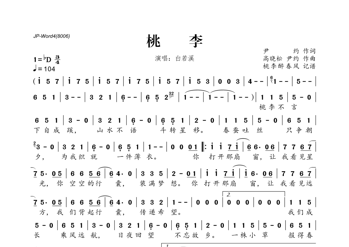 《桃李》是白若溪演唱的一首歌曲,拍号为3/4拍,歌曲速度为每分钟104拍,这份简谱共有一张高清图谱,图谱由 @桃李醉春风 编配上传。