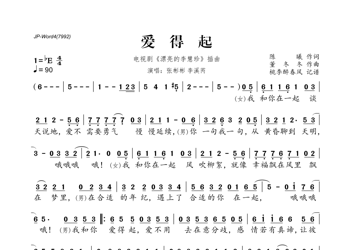 《爱得起》是张彬彬&李溪芮演唱的一首歌曲,拍号为4/4拍,歌曲速度为每分钟90拍,这份简谱共有一张高清图谱,图谱由 @桃李醉春风 编配上传。
