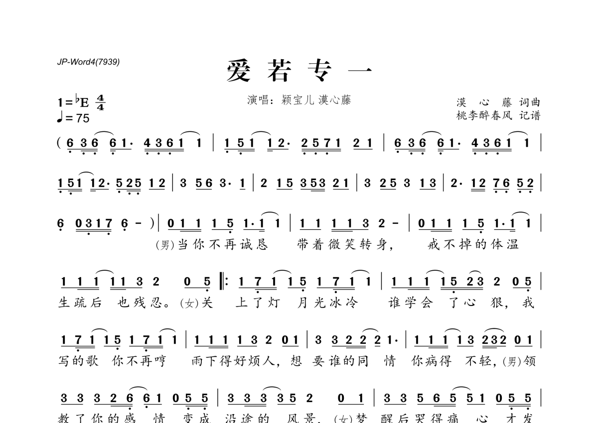 《爱若专一》是颖宝儿&漠心藤演唱的一首歌曲,拍号为4/4拍,歌曲速度为每分钟75拍,这份简谱共有一张高清图谱,图谱由 @桃李醉春风 编配上传。