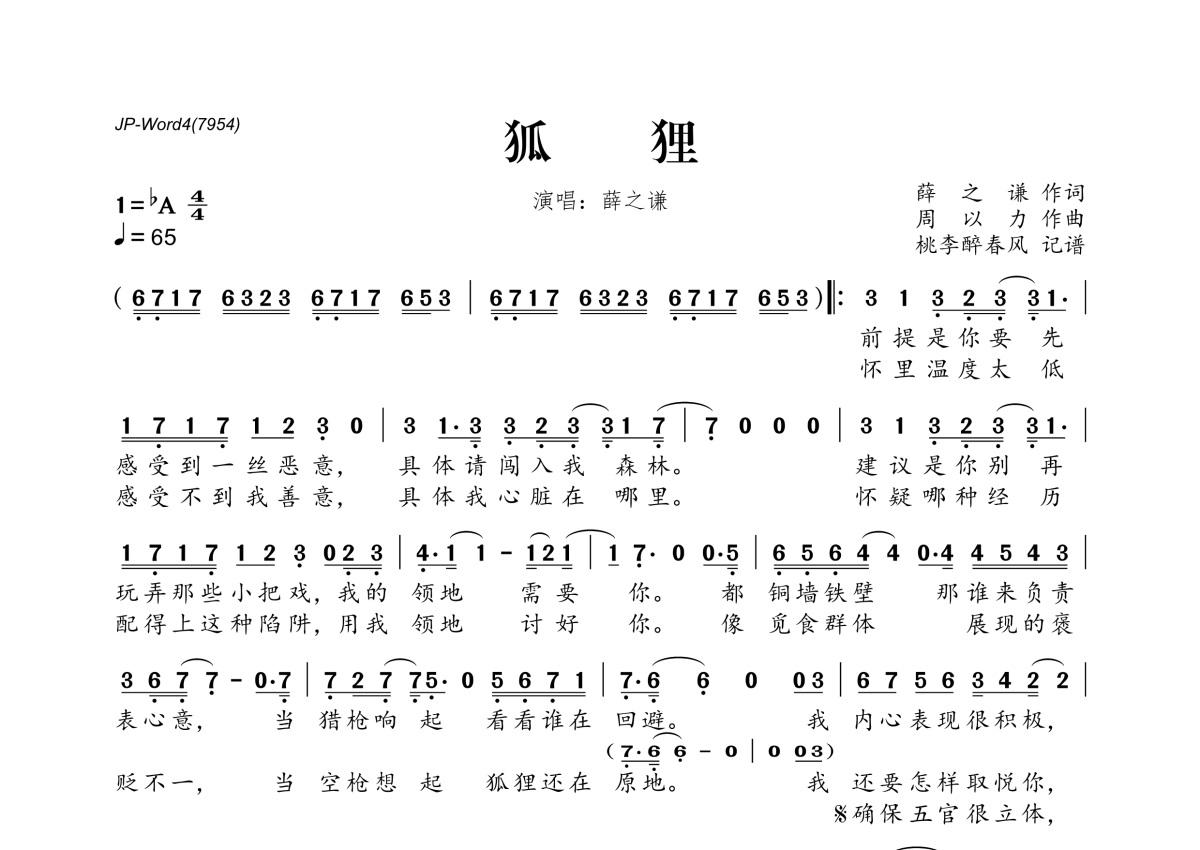 《狐狸》是薛之谦演唱的一首歌曲,拍号为4/4拍,歌曲速度为每分钟65拍,这份简谱共有一张高清图谱,图谱由 @桃李醉春风 编配上传。