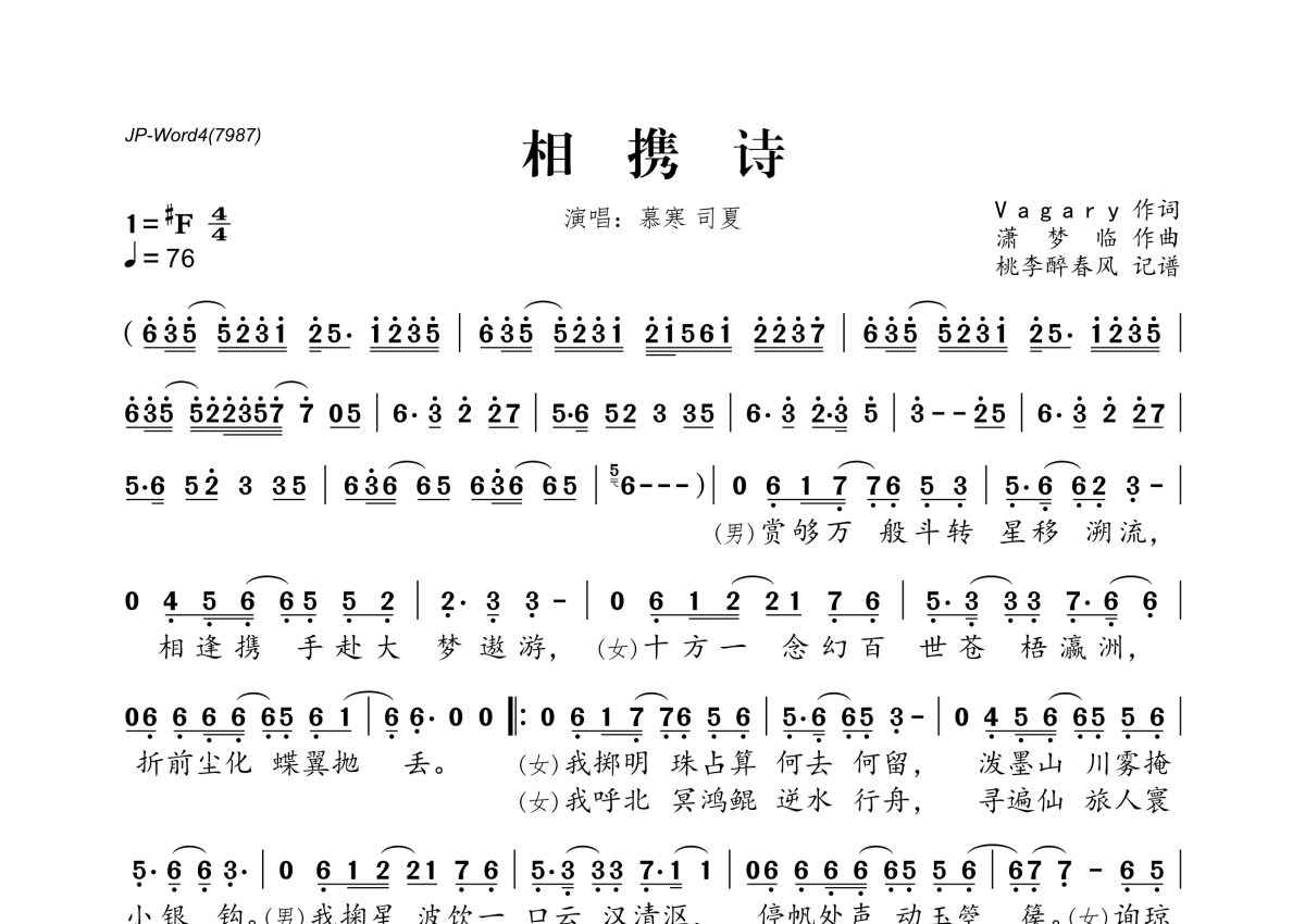 《相携诗》是司夏&慕寒演唱的一首歌曲,拍号为4/4拍,歌曲速度为每分钟76拍,这份简谱共有一张高清图谱,图谱由 @桃李醉春风 编配上传。