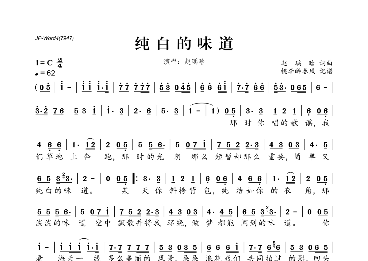 赵瑀晗《纯白的味道》简谱