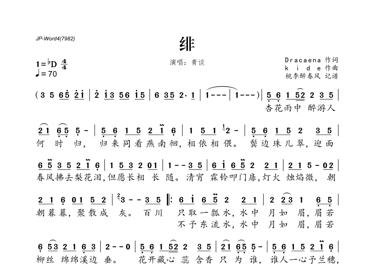 《绯》是青谈演唱的一首歌曲,拍号为4/4拍,歌曲速度为每分钟70拍,这份简谱共有一张高清图谱,图谱由 @桃李醉春风 编配上传。
