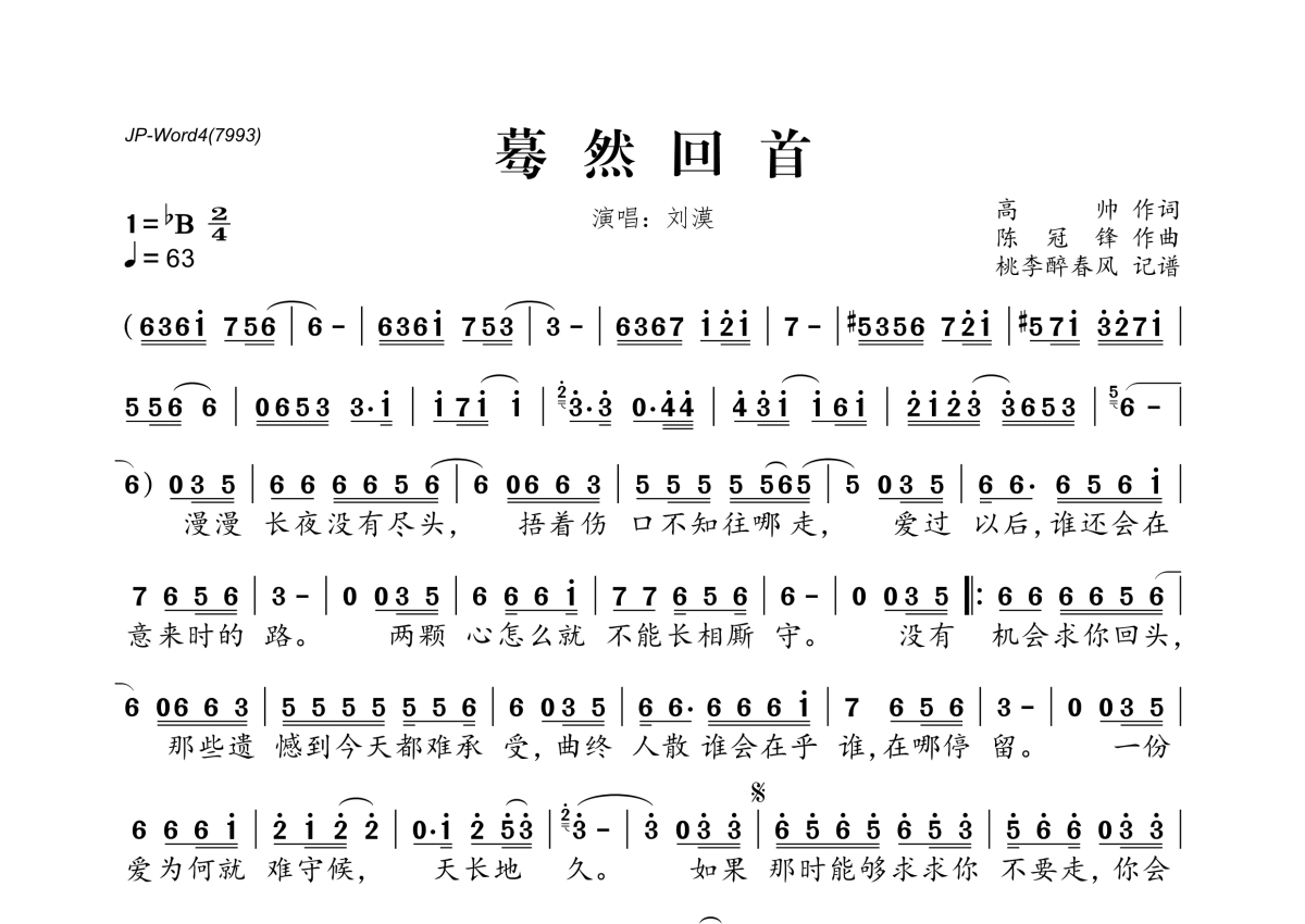 《蓦然回首》是刘漠演唱的一首歌曲,拍号为2/4拍,歌曲速度为每分钟63拍,这份简谱共有一张高清图谱,图谱由 @桃李醉春风 编配上传。
