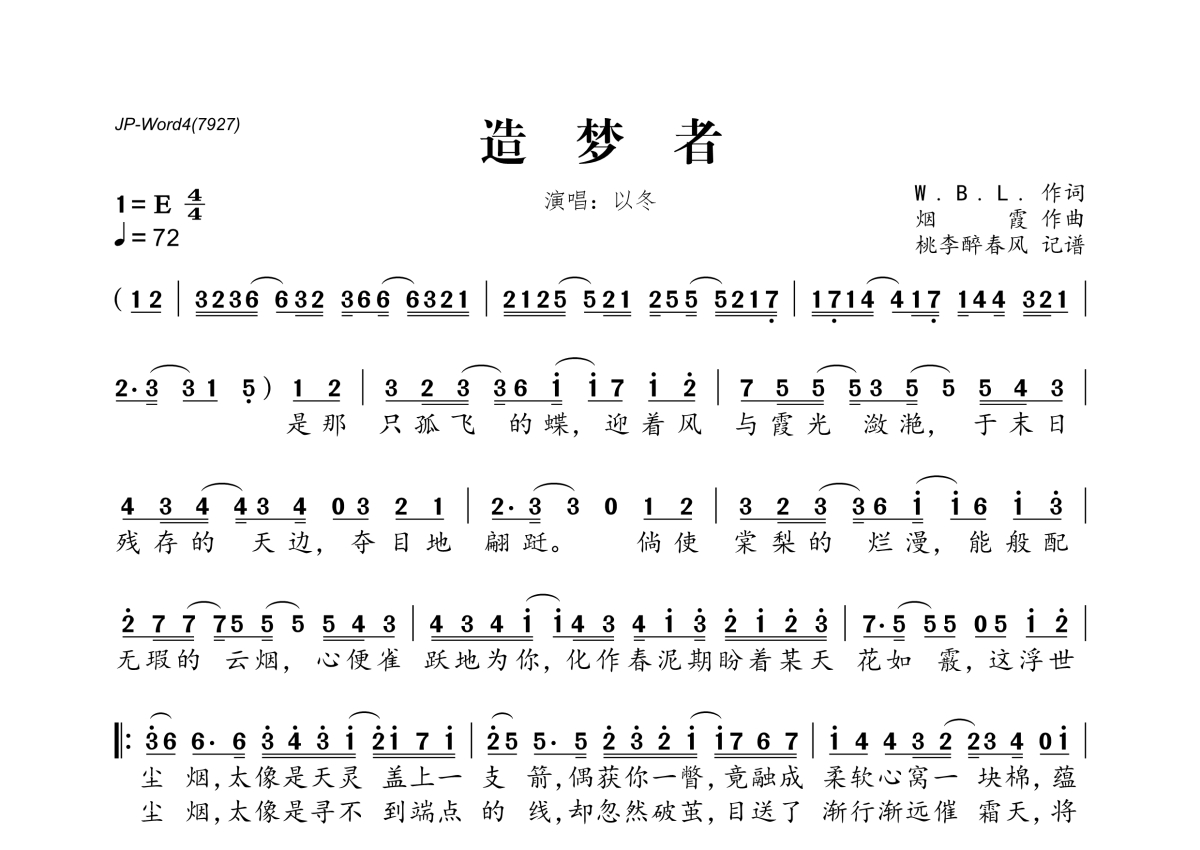 《造梦者》是以冬演唱的一首歌曲,拍号为4/4拍,歌曲速度为每分钟72拍,这份简谱共有两张高清图谱,图谱由 @桃李醉春风 编配上传。