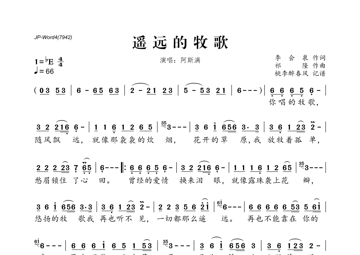 《遥远的牧歌》是阿斯满演唱的一首歌曲,拍号为4/4拍,歌曲速度为每分钟66拍,这份简谱共有一张高清图谱,图谱由 @桃李醉春风 编配上传。
