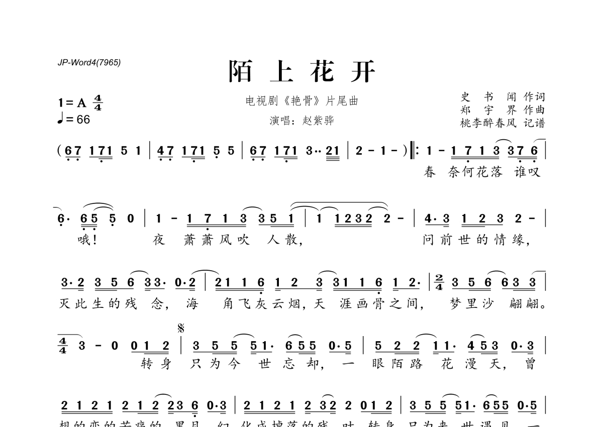 《陌上花开》是赵紫骅演唱的一首歌曲,拍号为4/4拍,歌曲速度为每分钟66拍,这份简谱共有一张高清图谱,图谱由 @桃李醉春风 编配上传。
