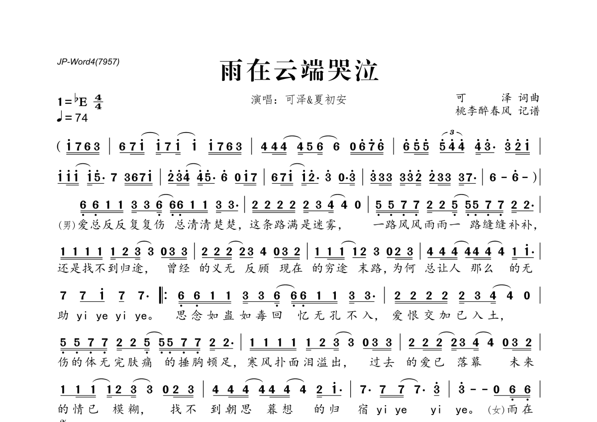 《雨在云端哭泣》是可泽&夏初安演唱的一首歌曲,拍号为4/4拍,歌曲速度为每分钟74拍,这份简谱共有一张高清图谱,图谱由 @桃李醉春风 编配上传。