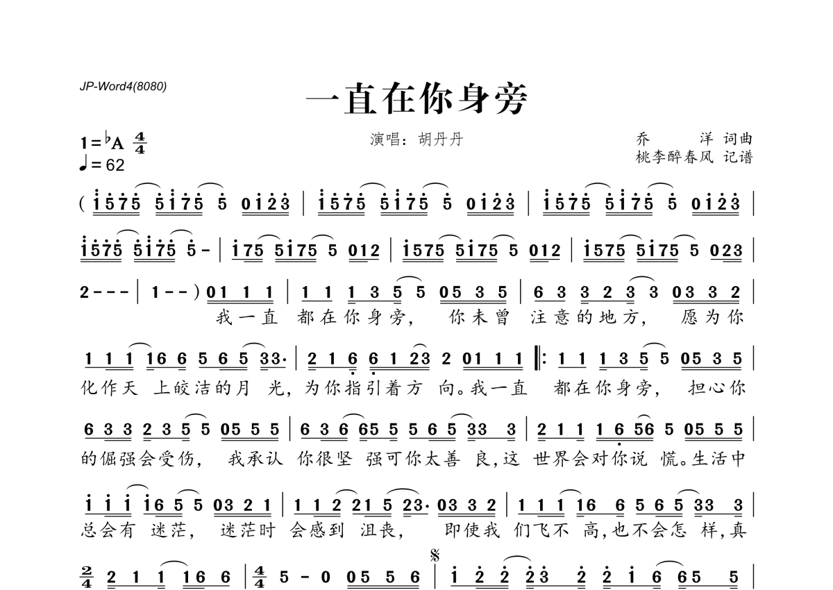 《一直在你身旁》是胡丹丹演唱的一首歌曲,拍号为4/4拍,歌曲速度为每分钟62拍,这份简谱共有一张高清图谱,图谱由 @桃李醉春风 编配上传。