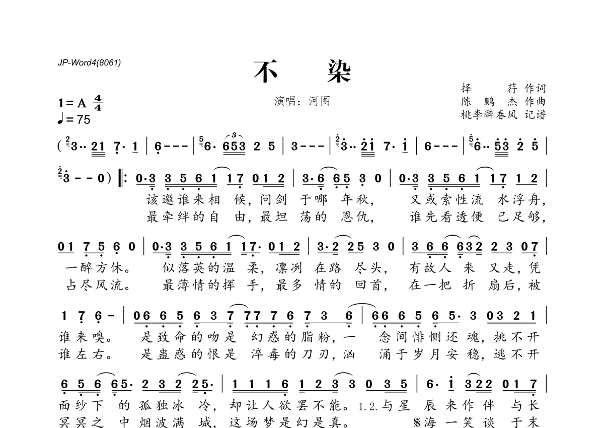 《不染》是河图演唱的一首歌曲,拍号为4/4拍,歌曲速度为每分钟75拍,这份简谱共有一张高清图谱,图谱由 @桃李醉春风 编配上传。