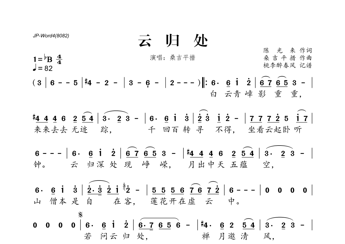 《云归处》是桑吉平措演唱的一首歌曲,拍号为4/4拍,歌曲速度为每分钟82拍,这份简谱共有一张高清图谱,图谱由 @桃李醉春风 编配上传。