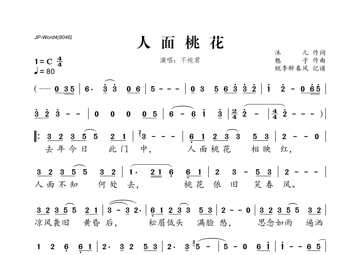 《人面桃花》是不纯君演唱的一首歌曲,拍号为4/4拍,歌曲速度为每分钟80拍,这份简谱共有一张高清图谱,图谱由 @桃李醉春风 编配上传。