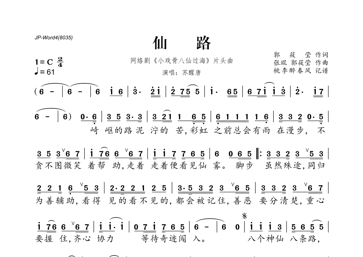 《仙路》是苏醒唐演唱的一首歌曲,拍号为2/4拍,歌曲速度为每分钟61拍,这份简谱共有一张高清图谱,图谱由 @桃李醉春风 编配上传。