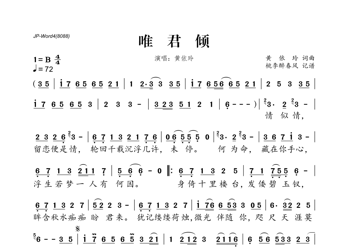 《唯君倾》是黄依玲演唱的一首歌曲,拍号为4/4拍,歌曲速度为每分钟72拍,这份简谱共有一张高清图谱,图谱由 @桃李醉春风 编配上传。
