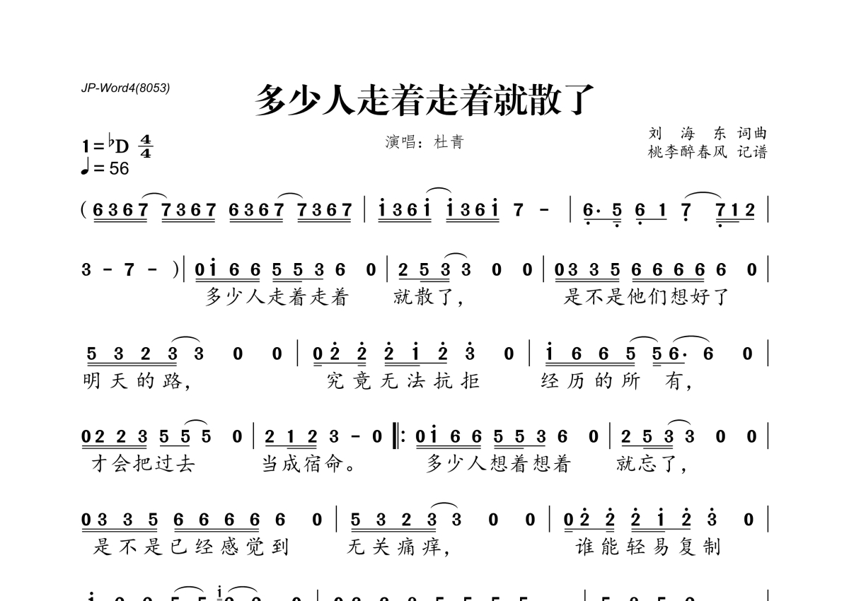 《多少人走着走着就散了》是杜青演唱的一首歌曲,拍号为4/4拍,歌曲速度为每分钟56拍,这份简谱共有一张高清图谱,图谱由 @桃李醉春风 编配上传。