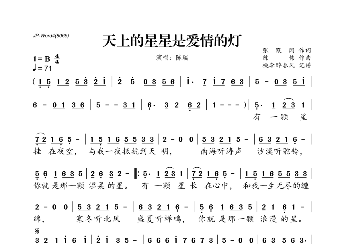 《天上的星星是爱情的灯》是陈瑞演唱的一首歌曲,拍号为4/4拍,歌曲速度为每分钟71拍,这份简谱共有一张高清图谱,图谱由 @桃李醉春风 编配上传。