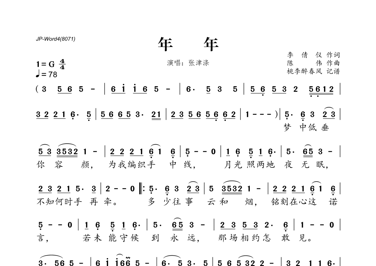 《年年》是张津涤演唱的一首歌曲,拍号为4/4拍,歌曲速度为每分钟78拍,这份简谱共有一张高清图谱,图谱由 @桃李醉春风 编配上传。