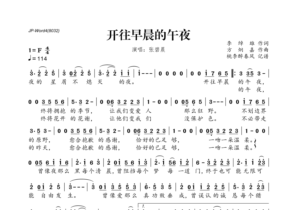 《开往早晨的午夜》是张碧晨演唱的一首歌曲,拍号为4/4拍,歌曲速度为每分钟114拍,这份简谱共有一张高清图谱,图谱由 @桃李醉春风 编配上传。