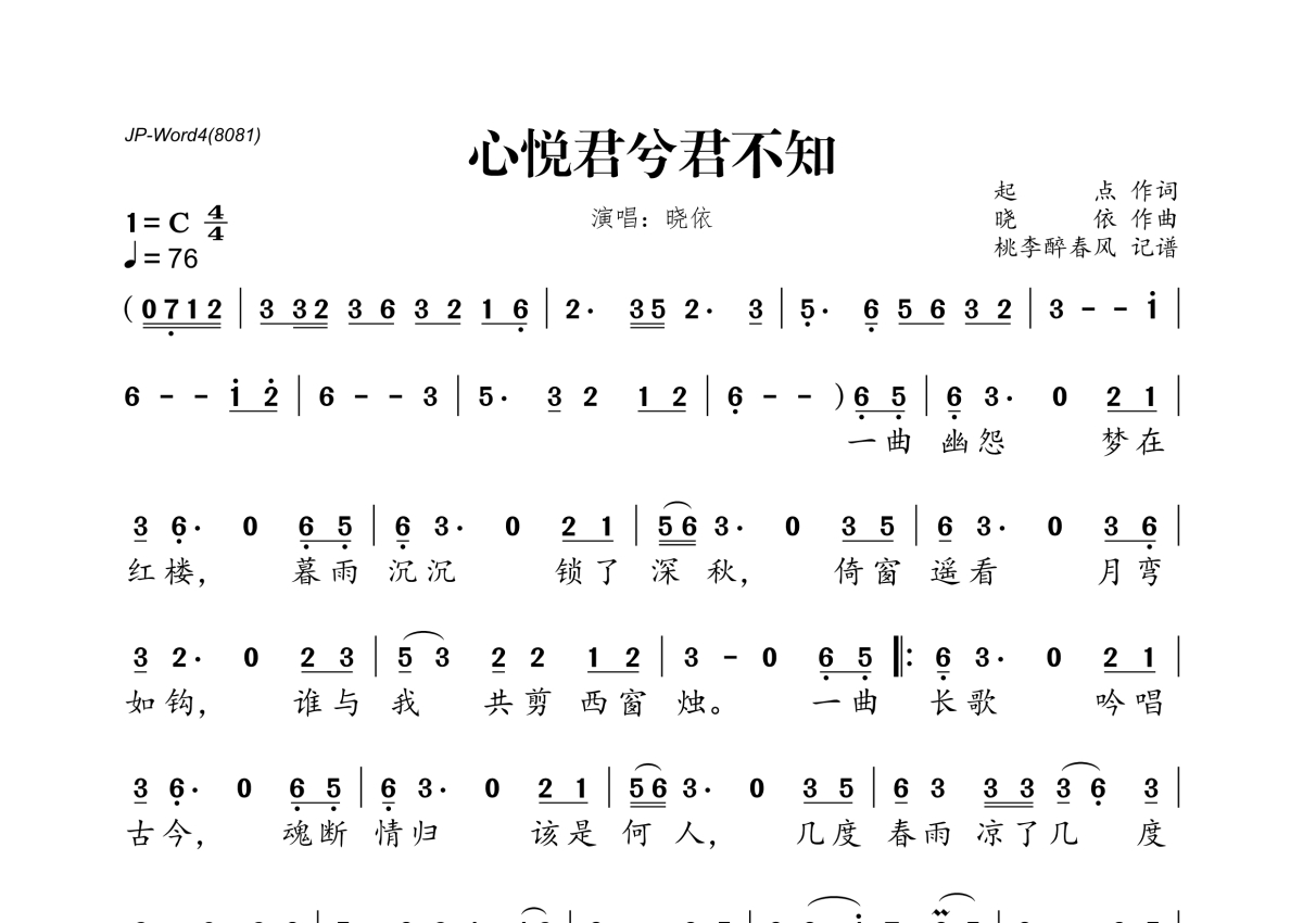 《心悦君兮君不知》是晓依演唱的一首歌曲,拍号为4/4拍,歌曲速度为每分钟76拍,这份简谱共有一张高清图谱,图谱由 @桃李醉春风 编配上传。