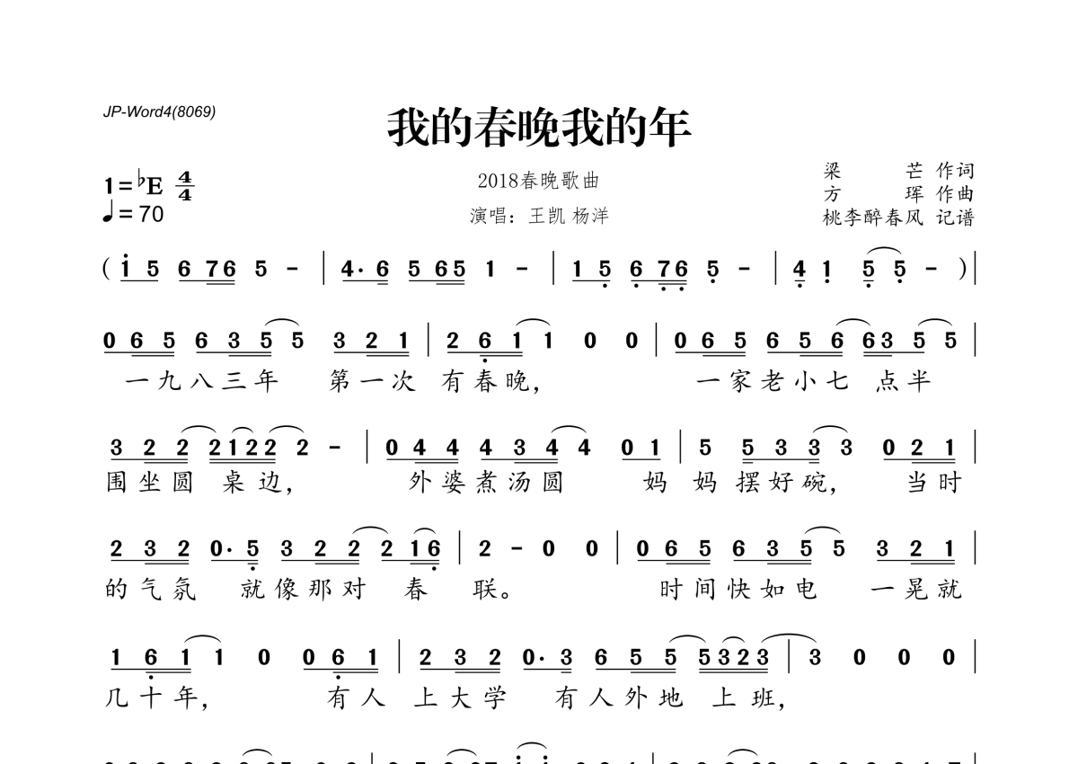 《我的春晚我的年》是王凯&杨洋演唱的一首歌曲,拍号为4/4拍,歌曲速度为每分钟70拍,这份简谱共有两张高清图谱,图谱由 @桃李醉春风 编配上传。