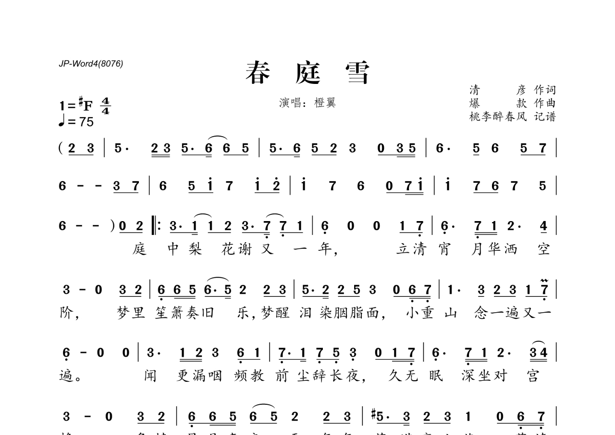 《春庭雪》是橙翼演唱的一首歌曲,拍号为4/4拍,歌曲速度为每分钟75拍,这份简谱共有一张高清图谱,图谱由 @桃李醉春风 编配上传。