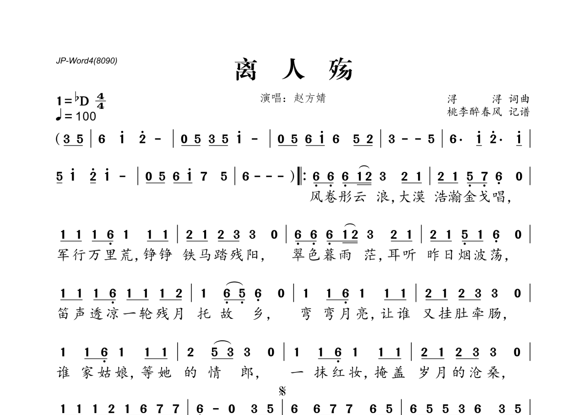 《离人殇》是赵方婧演唱的一首歌曲,拍号为4/4拍,歌曲速度为每分钟100拍,这份简谱共有一张高清图谱,图谱由 @桃李醉春风 编配上传。