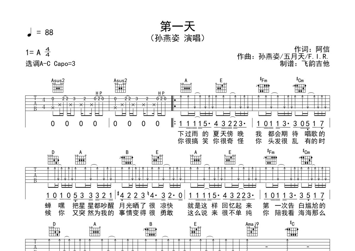 孙燕姿《第一天》吉他谱 - A调弹唱六线谱
