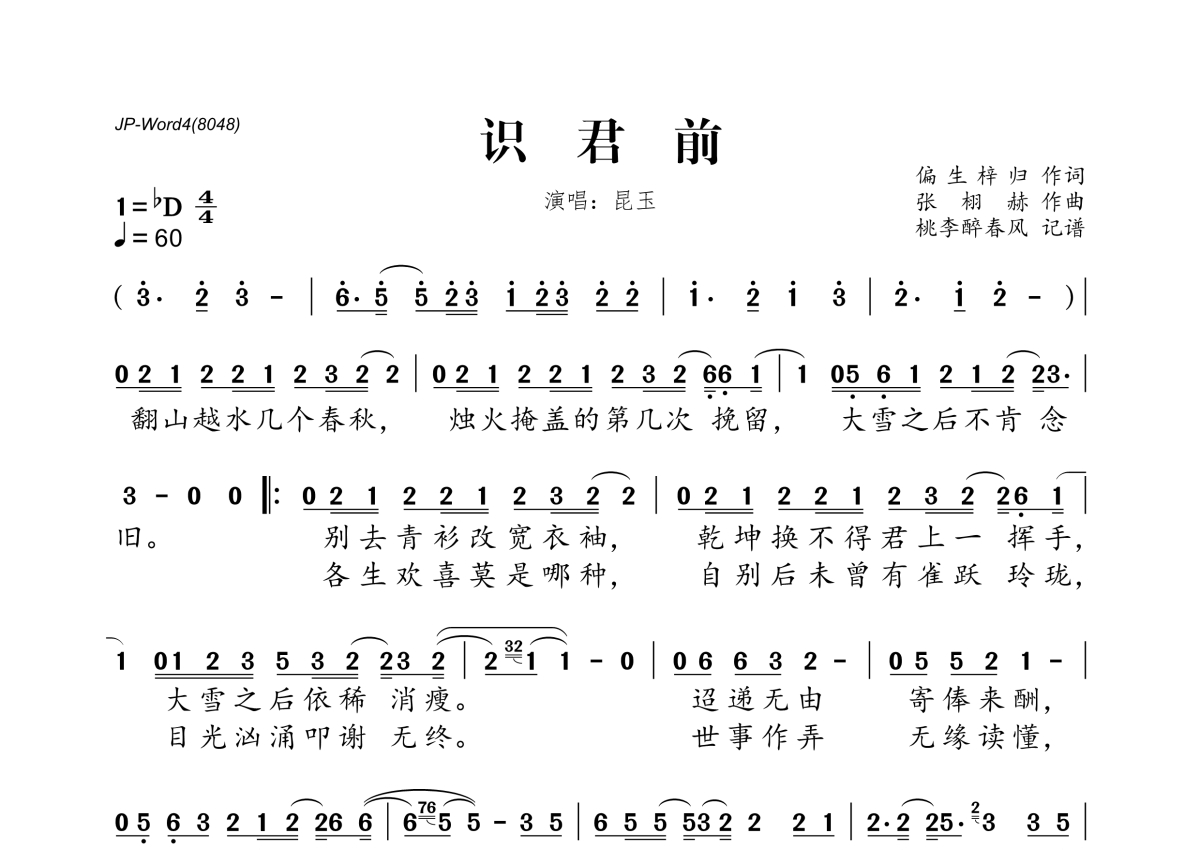 《识君前》是昆玉演唱的一首歌曲,拍号为4/4拍,歌曲速度为每分钟60拍,这份简谱共有一张高清图谱,图谱由 @桃李醉春风 编配上传。