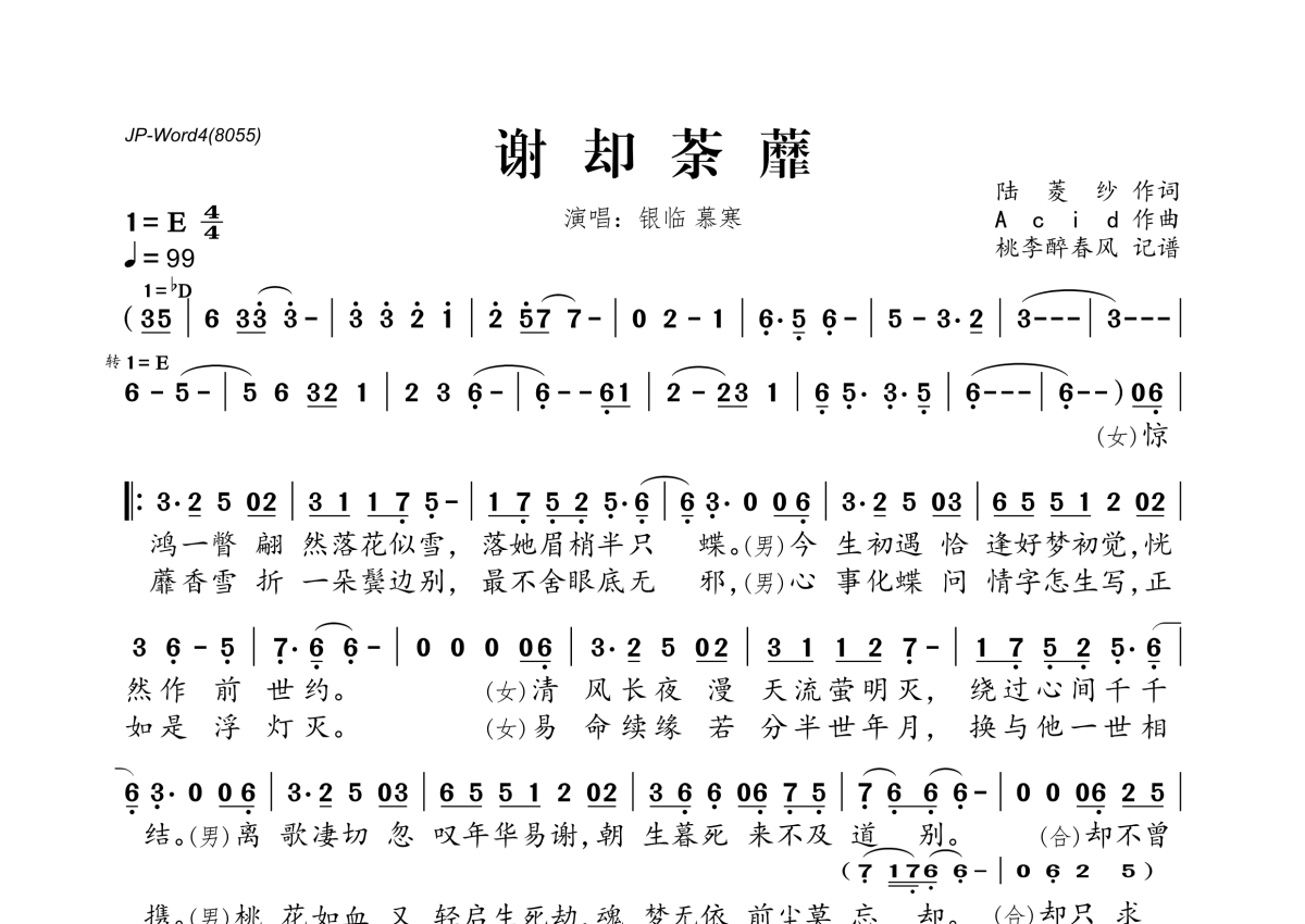 《谢却荼蘼》是银临&慕寒演唱的一首歌曲,拍号为4/4拍,歌曲速度为每分钟99拍,这份简谱共有一张高清图谱,图谱由 @桃李醉春风 编配上传。
