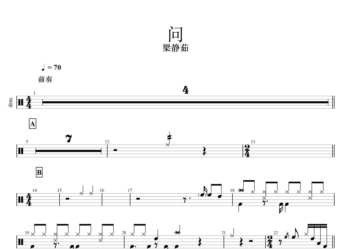 《问》是梁静茹演唱的一首歌曲,这份鼓谱共有两张高清图谱,图谱由 @打鼓谱 编配上传,图谱使用五线谱编配,使用这份问架子鼓谱,你将能够轻松地敲打出这首梁静茹的问,快来尝试吧。《问》是由李宗盛词曲创作,陈淑桦演唱的一首歌曲。