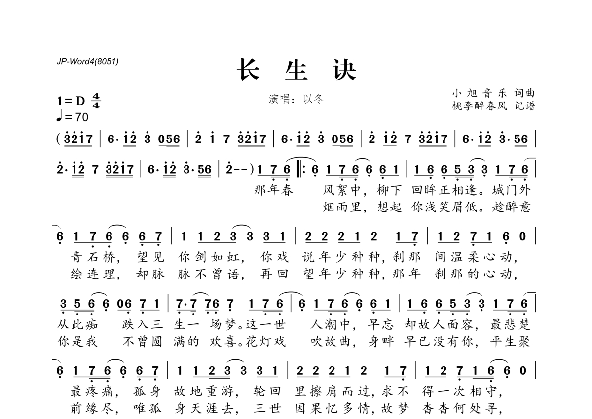 《长生诀》是以冬演唱的一首歌曲,拍号为4/4拍,歌曲速度为每分钟70拍,这份简谱共有一张高清图谱,图谱由 @桃李醉春风 编配上传。