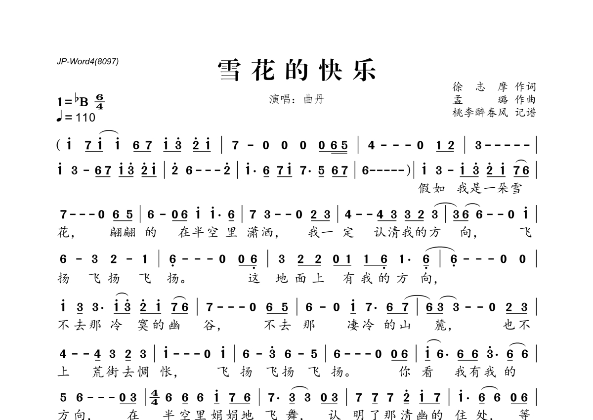 《雪花的快乐》是曲丹演唱的一首歌曲,歌曲速度为每分钟110拍,这份简谱共有一张高清图谱,图谱由 @桃李醉春风 编配上传。