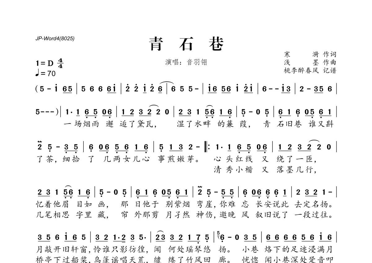 《青石巷》是音羽翎演唱的一首歌曲,拍号为4/4拍,歌曲速度为每分钟70拍,这份简谱共有一张高清图谱,图谱由 @桃李醉春风 编配上传。